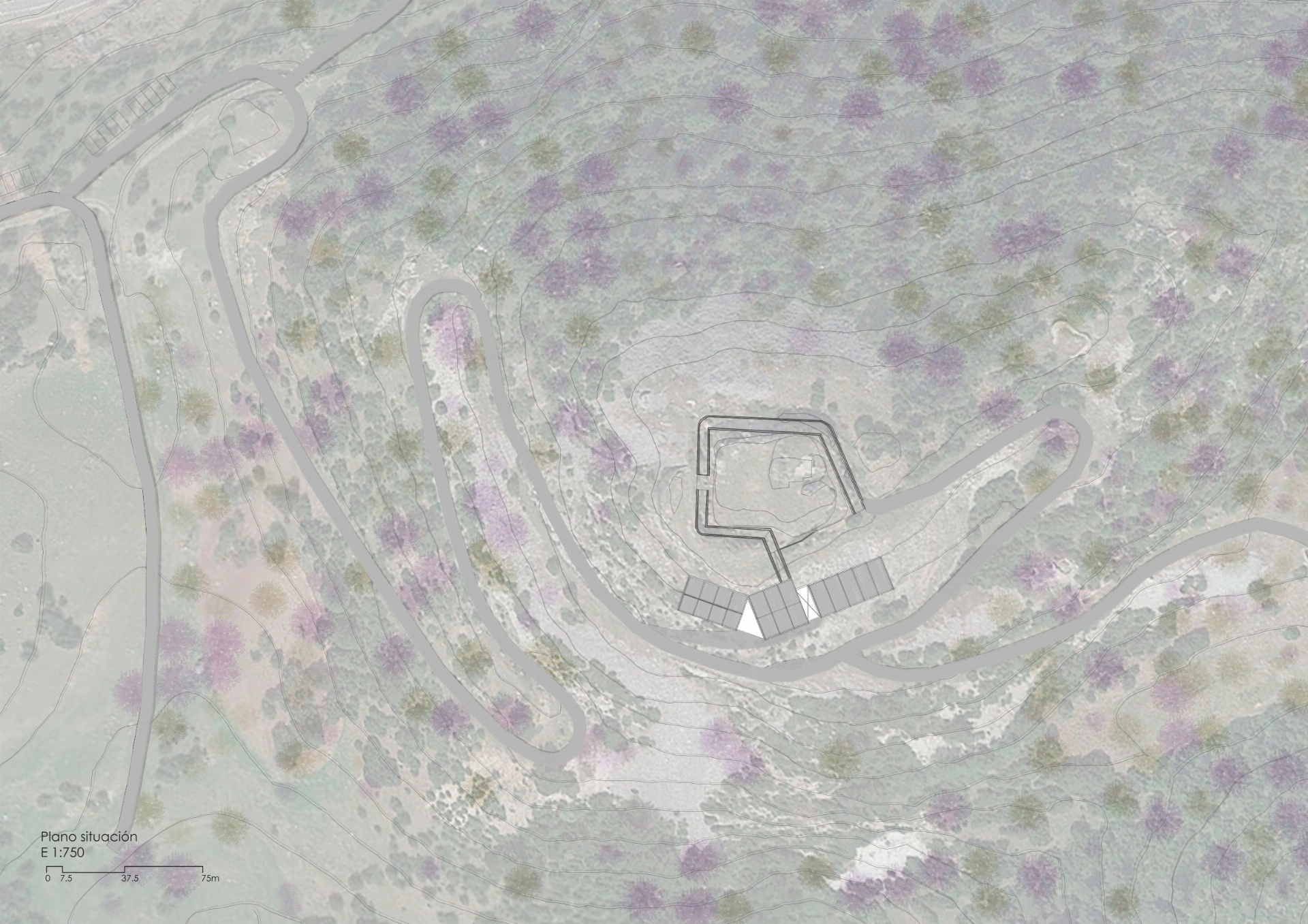 El proyecto propone un Centro de Interpretación en el valle del río Aragón, concebido como un mirador que se integra en la ladera junto al Fuerte de la Sagüeta para reforzar la lectura del paisaje y su memoria cultural. La intervención se articula mediante una estructura modular que fragmenta el edificio en tres piezas unidas por patios, generando una secuencia de