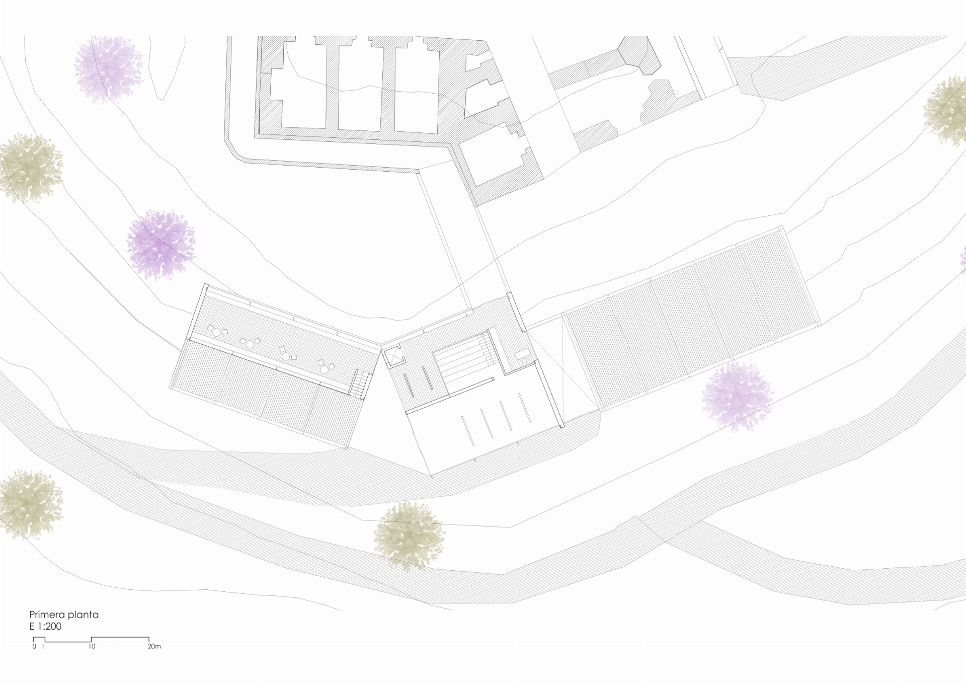 recorridos que se alternan entre interior y exterior. En la pieza central se sitúa el área expositiva y la sala multiusos, conectada directamente con el foso del fuerte; en el ala izquierda se organizan la cafetería y los espacios de estancia; y en el ala derecha, el albergue para visitantes, con dormitorios y zonas comunes orientadas hacia las vistas. La materialidad combina piedra en el exterior y madera en el interior, de modo que el edificio se adosa al terreno incluyendo las miradas tanto l fuerte como a Col de ladrones.