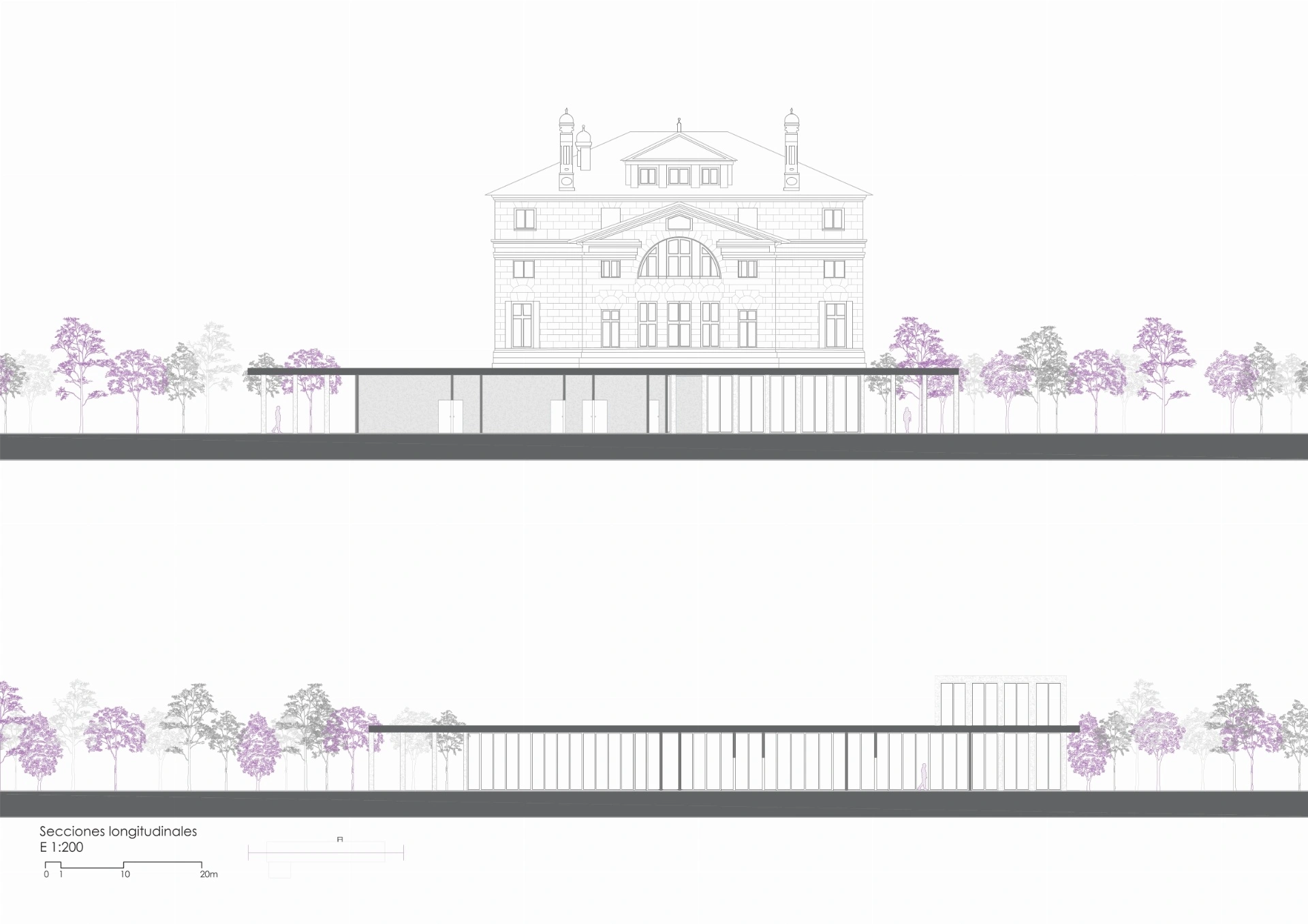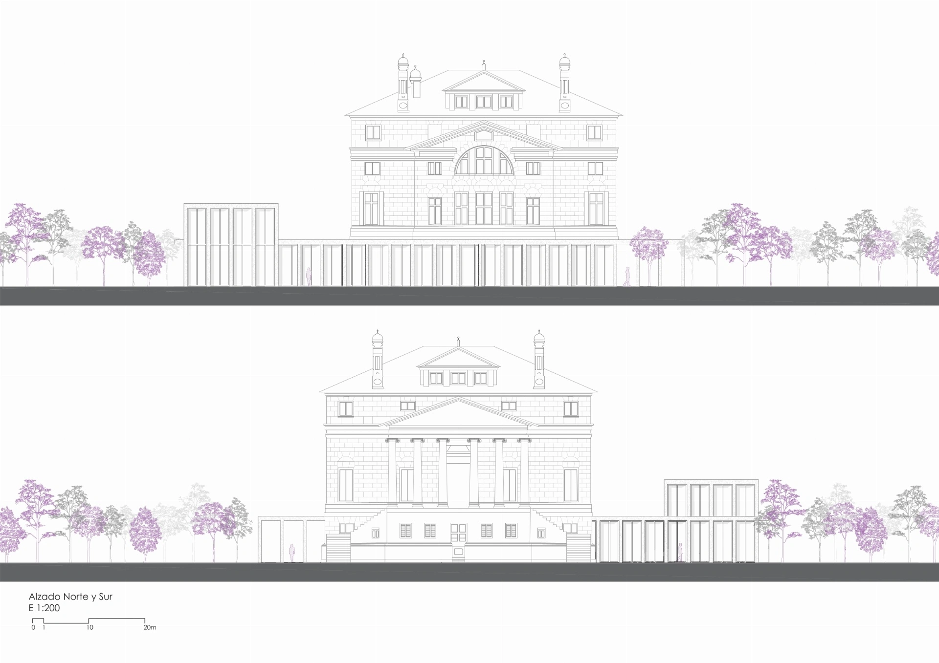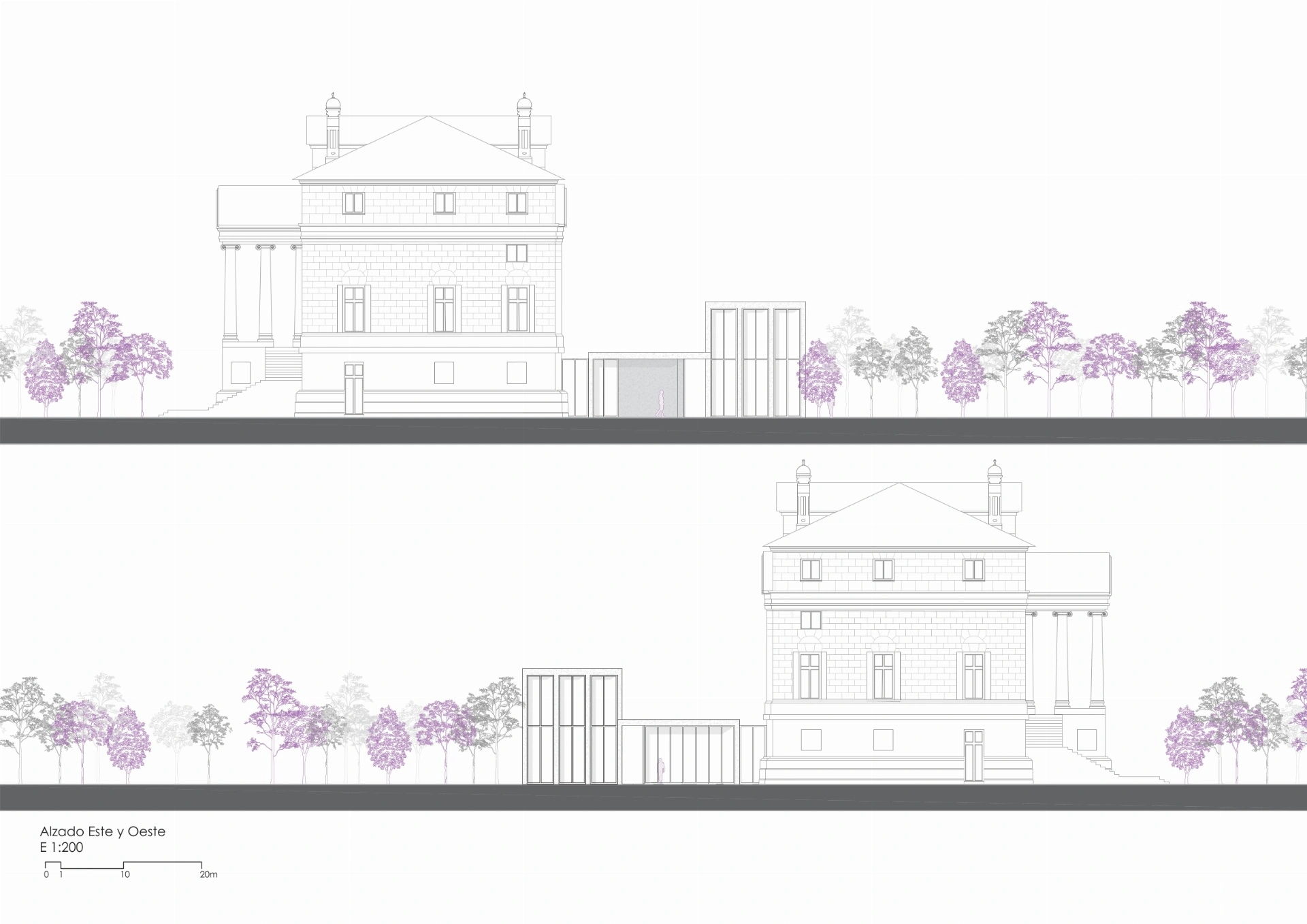 El proyecto plantea una ampliación contemporánea de la Villa Foscari destinada a acoger a la familia de los hijos de los propietarios, permitiendo la convivencia intergeneracional sin renunciar a la privacidad y autonomía de cada núcleo familiar. La intervención se organiza a partir de tres volúmenes conectados: la villa histórica, que continúa siendo habitada por los abuelos; una nueva pieza residencial para los hijos; y un taller independiente para el padre de a familia que es artista, todos ellos cuidadosamente dimensionados para mantener una relación equilibrada de escala con el edificio preexistente. La ampliación se vincula a la villa mediante una conexión acristalada en la planta basamental, mientras que un sistema de pórticos articula la relación entre la vivienda y el taller, generando espacios intermedios que permiten encuentros puntuales sin invadir la Intimidad doméstica. La nueva vivienda se desarrolla de forma lineal, diferenciando claramente las zonas públicas y privadas y abriendo las estancias familiares al exterior, mientras que la materialidad y estructura de hormigón armado con cerramientos acristalados y carpinterías oscuras establece un diálogo sobrio y respetuoso entre lo nuevo y lo existente, resolviendo la ampliación como una pieza autónoma, contemporánea y coherente con la vida familiar y creativa que alberga.