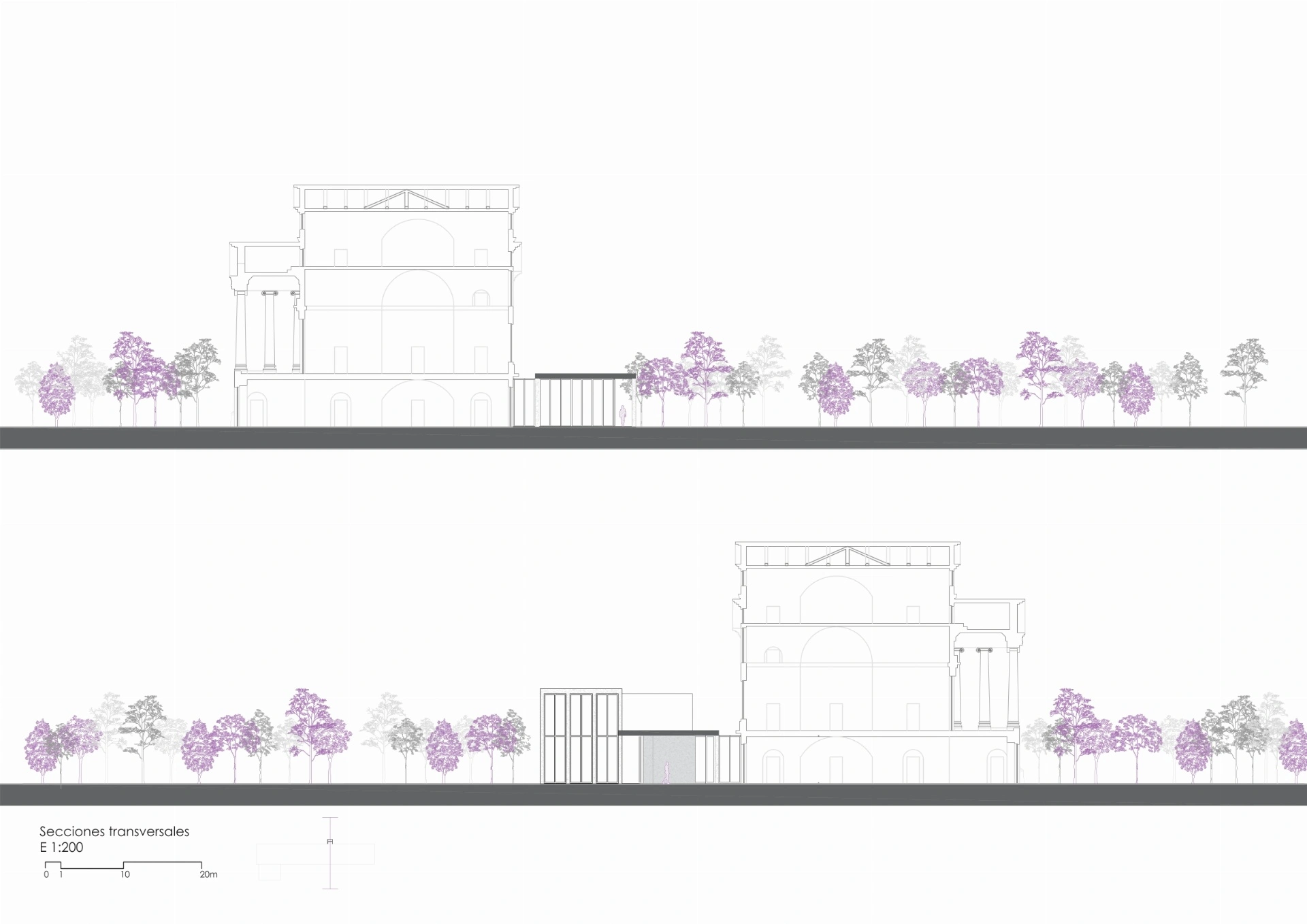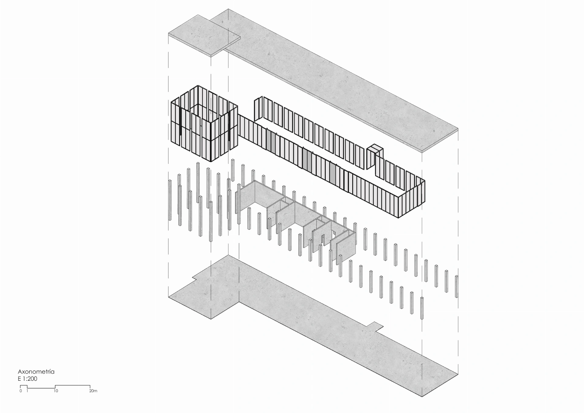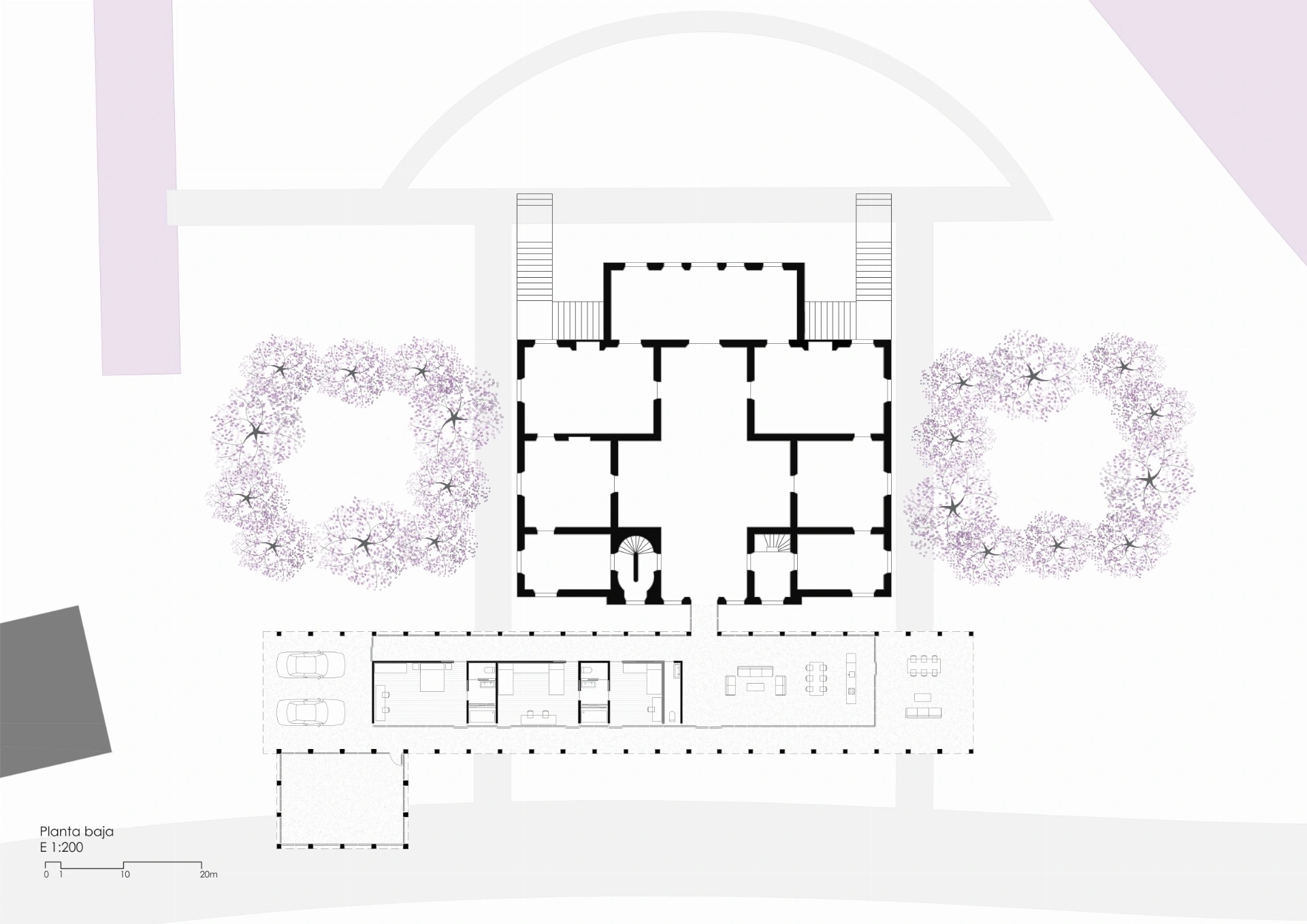El proyecto plantea una ampliación contemporánea de la Villa Foscari destinada a acoger a la familia de los hijos de los propietarios, permitiendo la convivencia intergeneracional sin renunciar a la privacidad y autonomía de cada núcleo familiar. La intervención se organiza a partir de tres volúmenes conectados: la villa histórica, que continúa siendo habitada por los abuelos; una nueva pieza residencial para los hijos; y un taller independiente para el padre de a familia que es artista, todos ellos cuidadosamente dimensionados para mantener una relación equilibrada de escala con el edificio preexistente. La ampliación se vincula a la villa mediante una conexión acristalada en la planta basamental, mientras que un sistema de pórticos articula la relación entre la vivienda y el taller, generando espacios intermedios que permiten encuentros puntuales sin invadir la Intimidad doméstica. La nueva vivienda se desarrolla de forma lineal, diferenciando claramente las zonas públicas y privadas y abriendo las estancias familiares al exterior, mientras que la materialidad y estructura de hormigón armado con cerramientos acristalados y carpinterías oscuras establece un diálogo sobrio y respetuoso entre lo nuevo y lo existente, resolviendo la ampliación como una pieza autónoma, contemporánea y coherente con la vida familiar y creativa que alberga.
